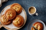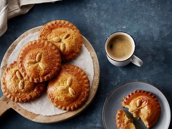 Koek gemaakt van roomboterdeeg dat is gevuld met zuivere amandelspijs en afgegarneerd met 3 amandelen.