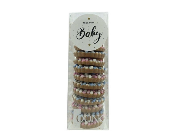 185 gram roze & blauwe geboorte flikken. Gemaakt van melkchocolade.