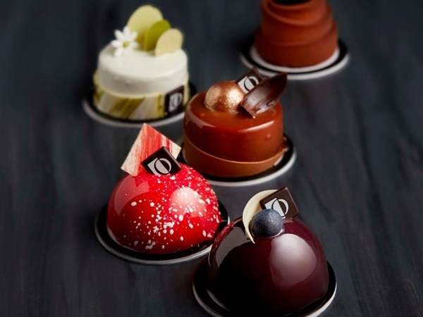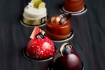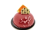 Witte chocolade mousse met een interieur van aardbeien cremeux en aardbeien compote op een een krokante noten bodem.