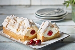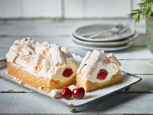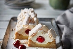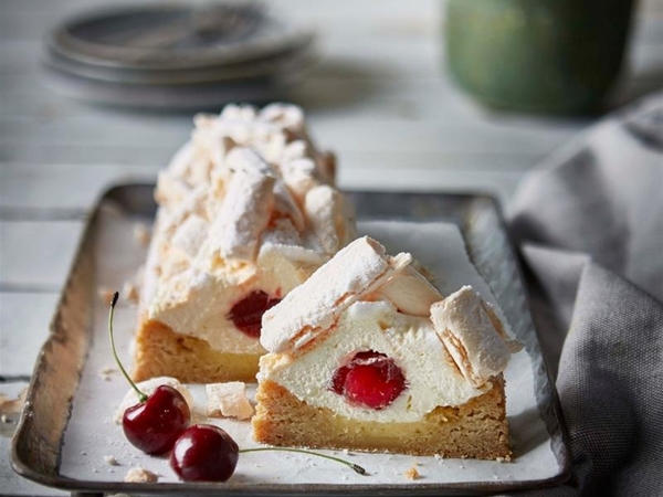 Een van onze toppers: een bodem van roomboterdeeg met meegebakken zuiver amandelspijs, gevuld met een laag room en kersen en gegarneerd met schuimpijpjes.
