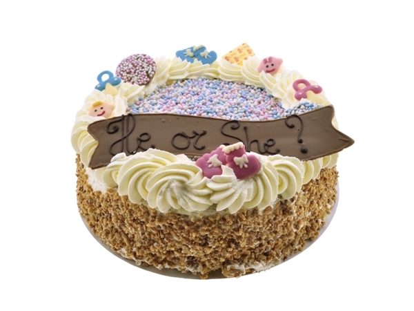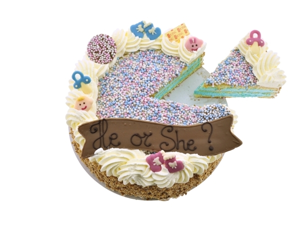 Deze gender reveal taart is voor 12 personen. Het is een slagroomtaart die wordt gevuld met de gewenste kleur slagroom en is opgemaakt met geboorte muisjes en geboorte decoratie. Daarnaast kan u er zelf een leuke tekst aan toevoegen!